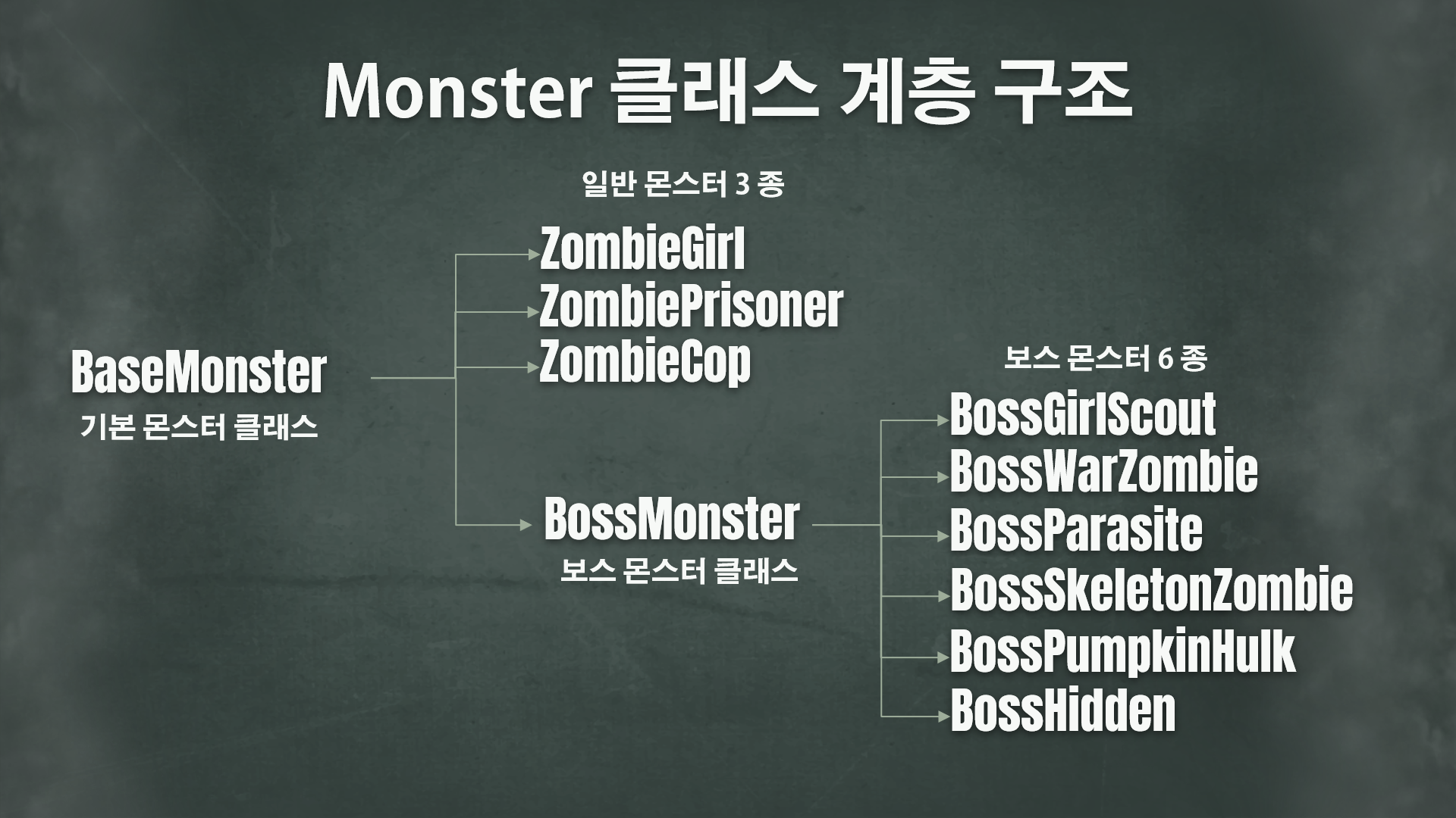 몬스터 타입(일반, 보스) 별 각 기능을 구상하며 위와 같이 클래스를 설계하였습니다.