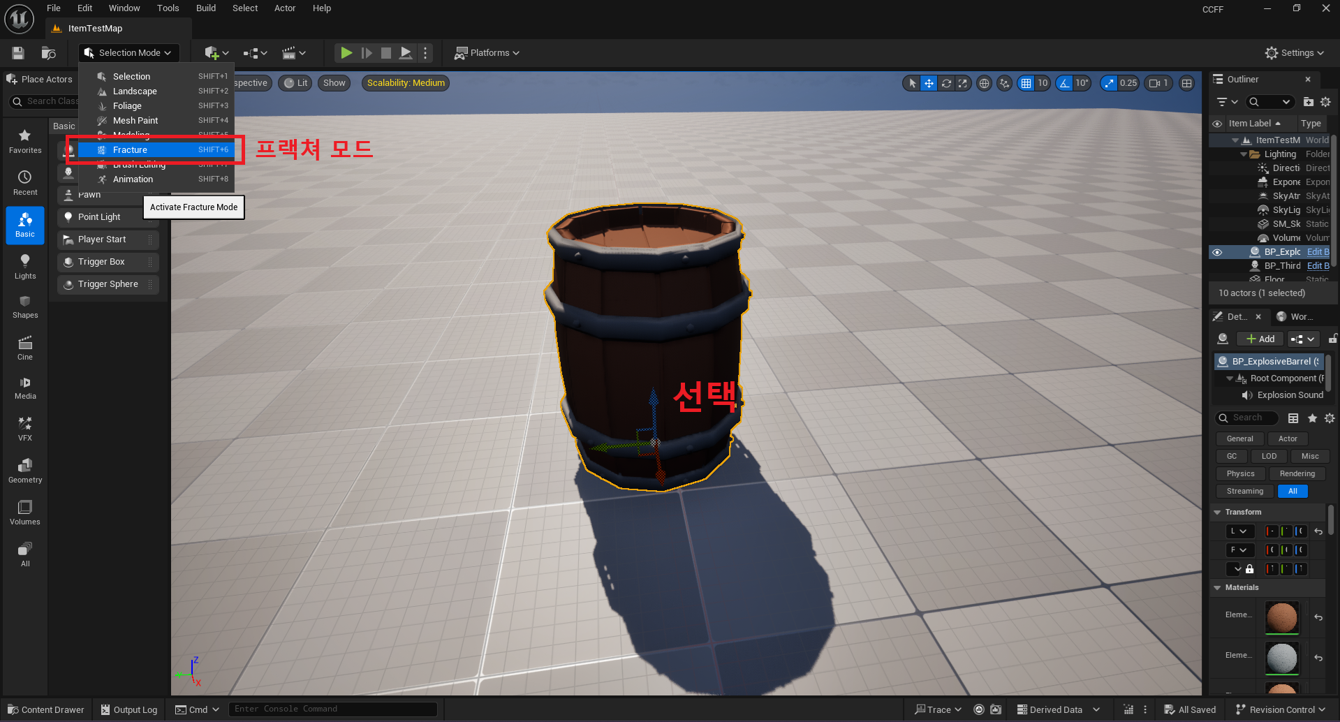 (1). 파괴 연출을 주고 싶은 StaticMesh(StaticMesh를 포함한 Actor도 무관)을 선택하고 Fracture 모드에 들어갑니다.