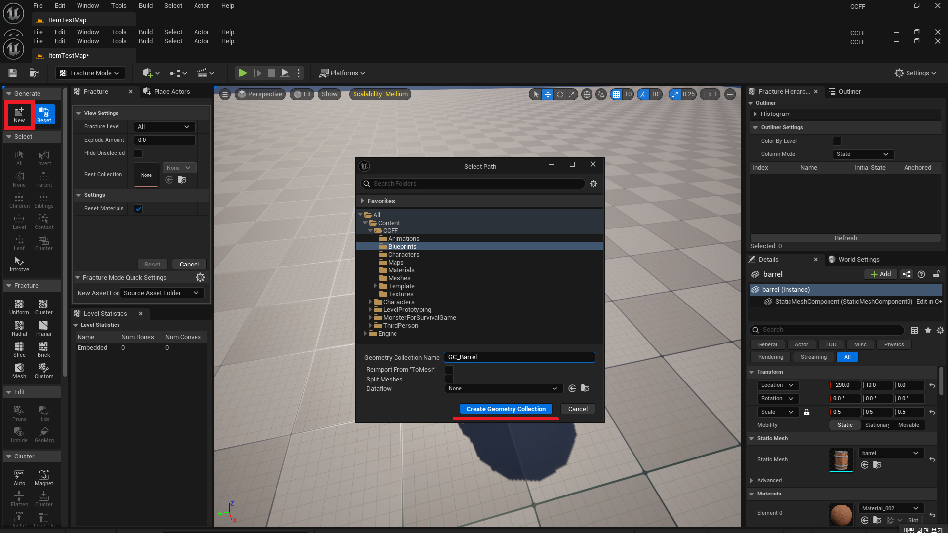 (2). Fracture 모드에서 New를 눌러 Geometry Collection을 생성해 원하는 경로에 저장합니다. (파일명: GC_"머시기")