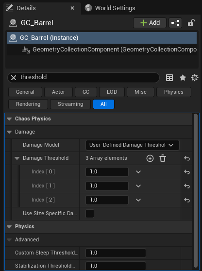 (2). 직접 시뮬레이션을 테스트해보고 싶을 때는 Geometry Collection의 Details 패널에서 Damage Threshold 값을 모두 1로 설정한 후, Play in Editor의 Simulate 버튼을 눌러 손쉽게 Destruction 효과를 확인할 수 있습니다.